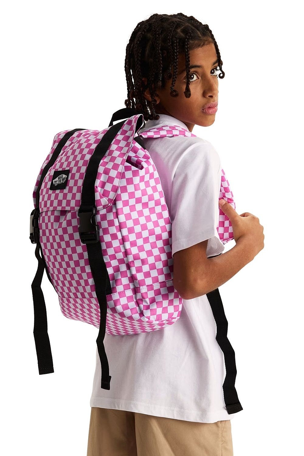 Sac à dos Vans Utility Junior : un modèle urbain pratique alliant fonctionnalité et style skate caractéristique de la marque Vans. Il se distingue par son motif en damier rose très marqué, qui lui confère un look original.